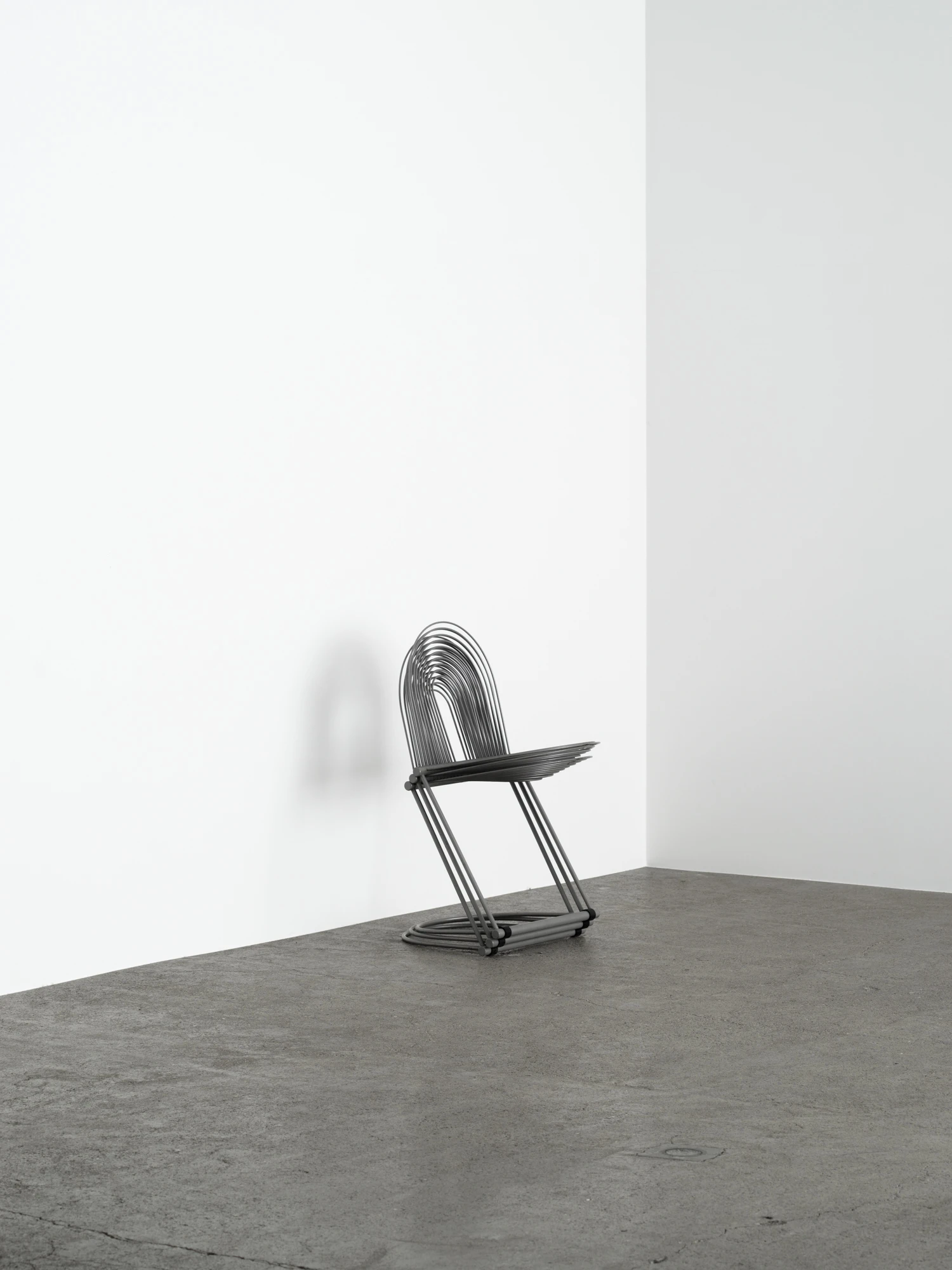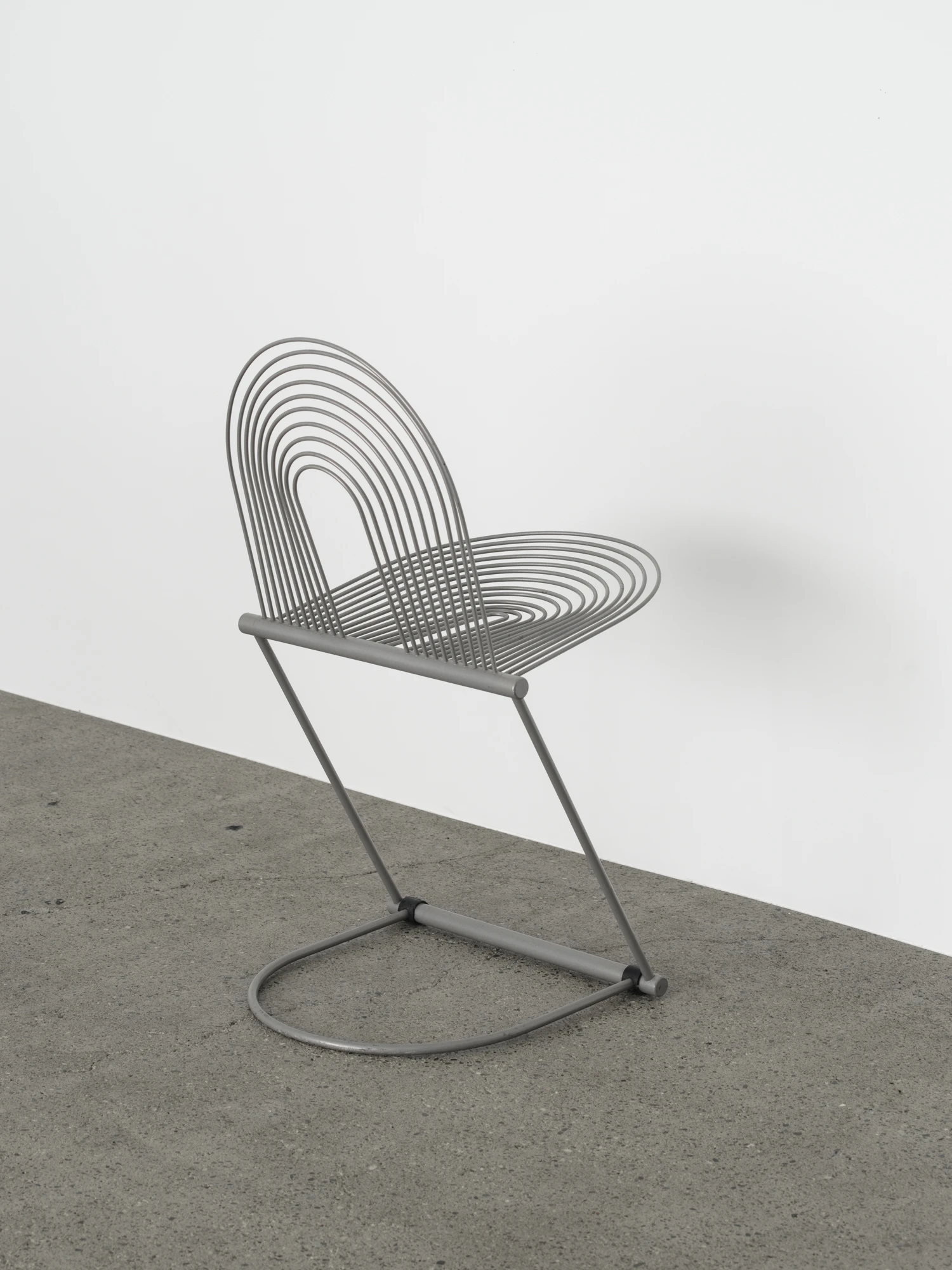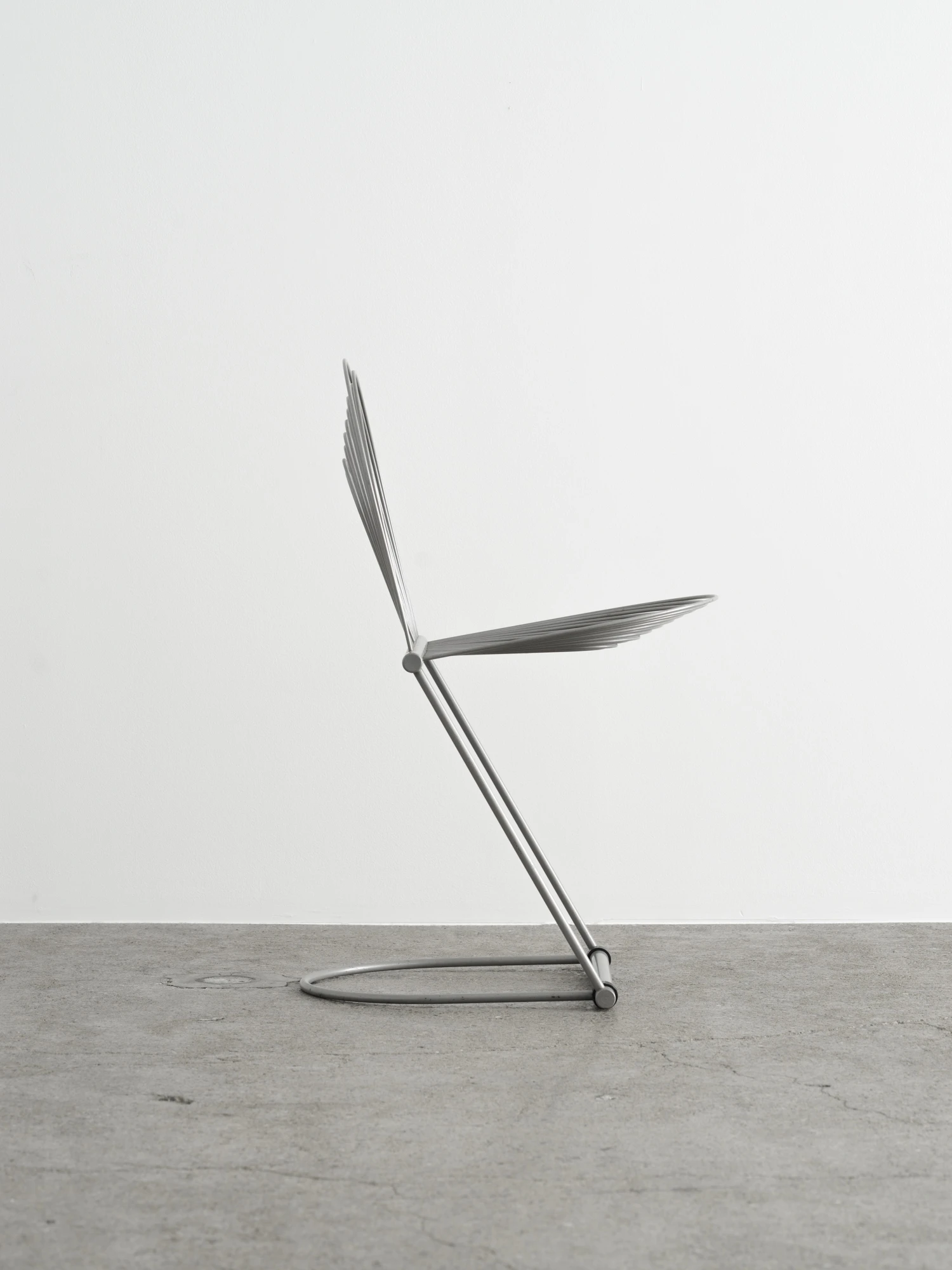 Herbert & Jutta Ohlがドイツの老舗磁器メーカーRosenthal Lubkeの家具ラインのために1982年にデザインしたチェア。一見極端に実験的な印象を受けるが、座ってみれば実用的な椅子であることが分かる。主要な構造を担うのは研ぎ澄まされたスチール製フレーム。他のカンチレバー式チェアとは一線を画し、強度を担う太い部材から繊細な2本のロッドが伸びる。これによって、座る人の体重と動きに応じて柔軟に沈み込み、体への負担を吸収する。「Swing Chair」という名前はこの動きから来ているのだろう。そして体を直接受け止める背と座は、長円形を描くさらに細いワイヤで構成されている。この椅子に椅子らしからぬグラフィカルなシルエットを与えるだけでなく、ワイヤのしなやかさが体を優しく受けとめて良好な座り心地を実現している。ポストモダニズム的な斬新な発想と視覚的な楽しさがありながら、機能性も両立している名品。