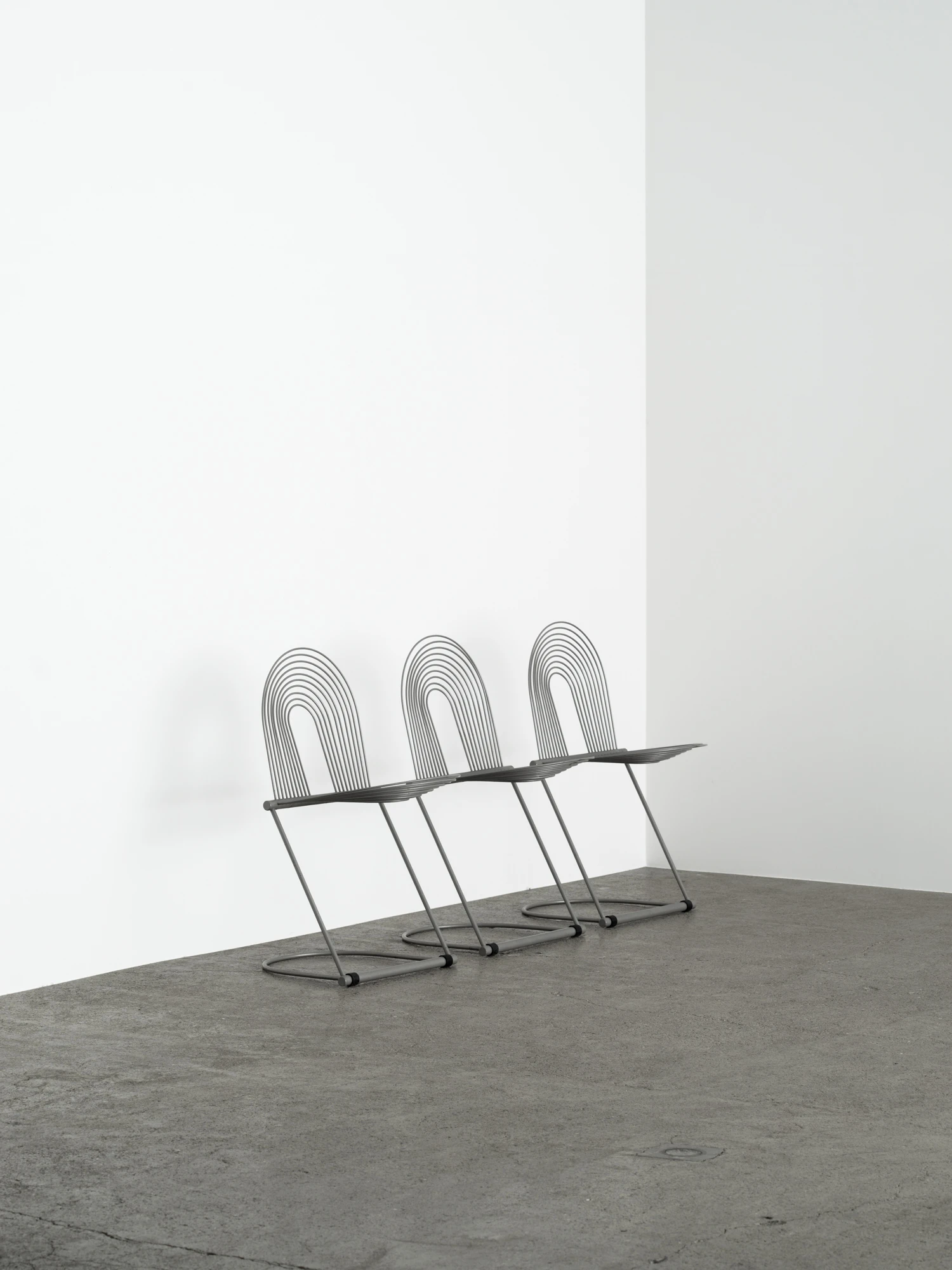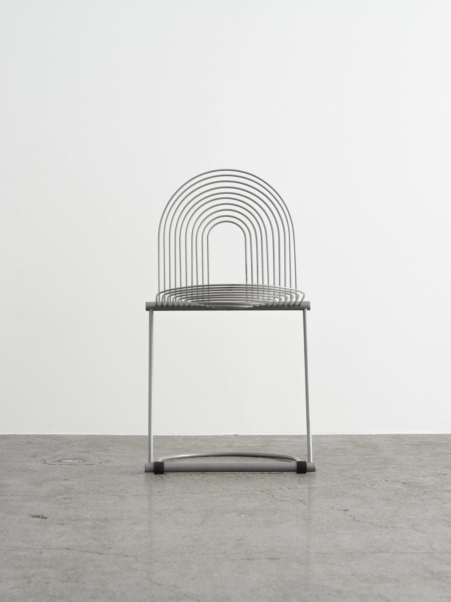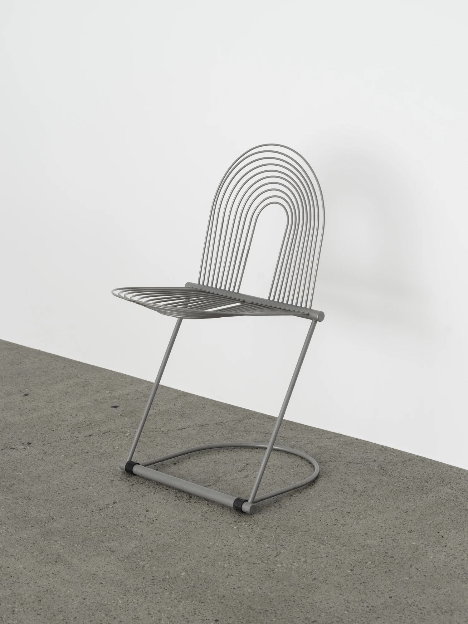 Herbert & Jutta Ohlがドイツの老舗磁器メーカーRosenthal Lubkeの家具ラインのために1982年にデザインしたチェア。一見極端に実験的な印象を受けるが、座ってみれば実用的な椅子であることが分かる。主要な構造を担うのは研ぎ澄まされたスチール製フレーム。他のカンチレバー式チェアとは一線を画し、強度を担う太い部材から繊細な2本のロッドが伸びる。これによって、座る人の体重と動きに応じて柔軟に沈み込み、体への負担を吸収する。「Swing Chair」という名前はこの動きから来ているのだろう。そして体を直接受け止める背と座は、長円形を描くさらに細いワイヤで構成されている。この椅子に椅子らしからぬグラフィカルなシルエットを与えるだけでなく、ワイヤのしなやかさが体を優しく受けとめて良好な座り心地を実現している。ポストモダニズム的な斬新な発想と視覚的な楽しさがありながら、機能性も両立している名品。