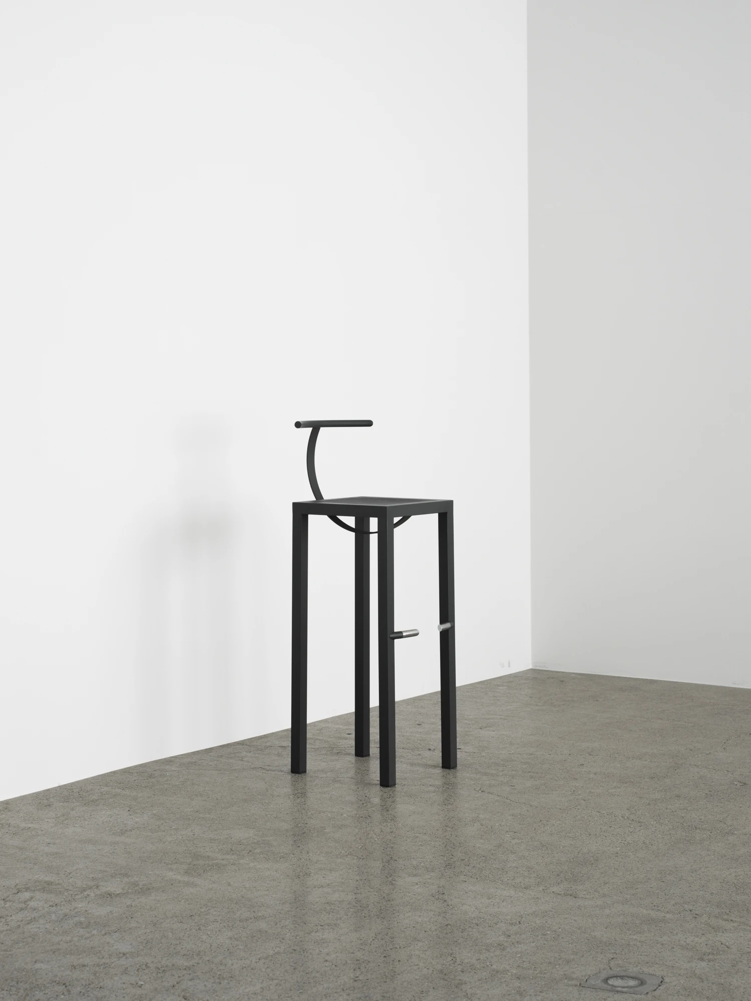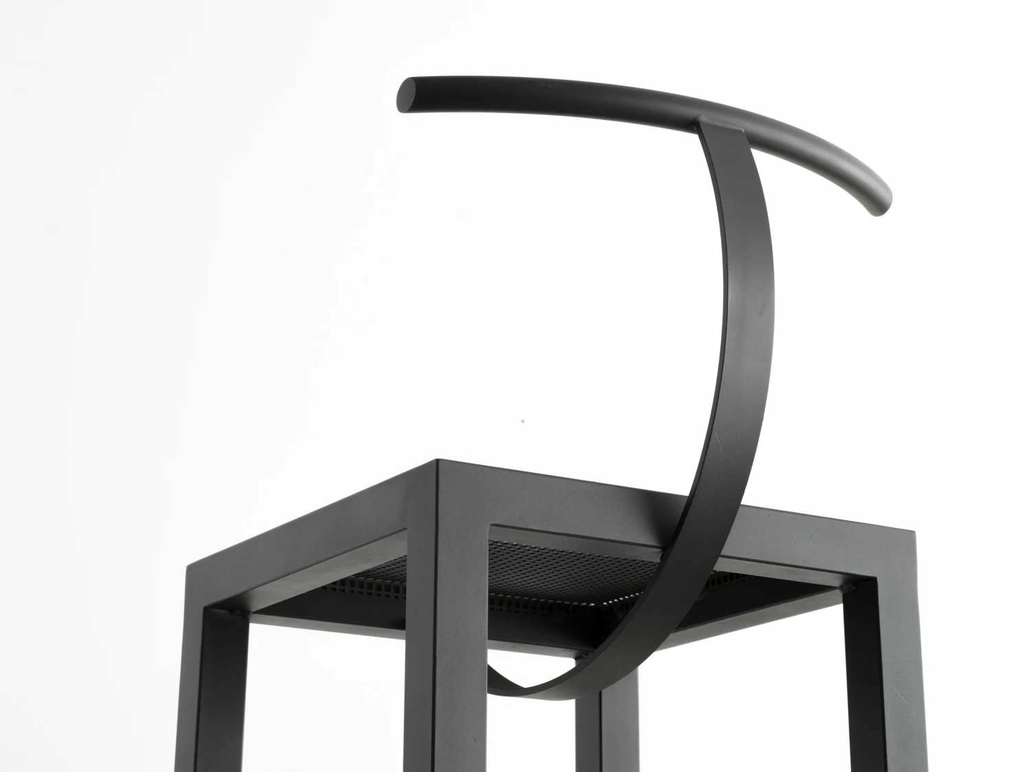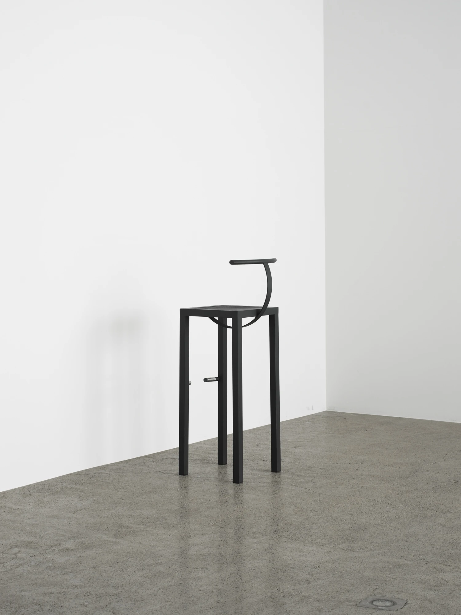 「Sarapis」を一目見たときに不思議な違和感に惹きつけられるのは、工業的な冷たさと、歩み寄りたくなるようなユニークさが一脚の椅子の中に同居しているからだろう。 スチールのみを使用し、ハイチェアの要素を幾何学形態のみで置き換えた構成にはバウハウス的な美学を感じさせつつも、他にはないシルエットを携えている。座面下から円弧を描くバーは、背にもたれることで程よくしなり柔らかく体を受け止める。脚部の中程には同じく円弧を描くフットレストが付く。初見の印象とは裏腹に、巧みに計算された家具としての機能性には、同デザイナーの持ち味が既に現れている。