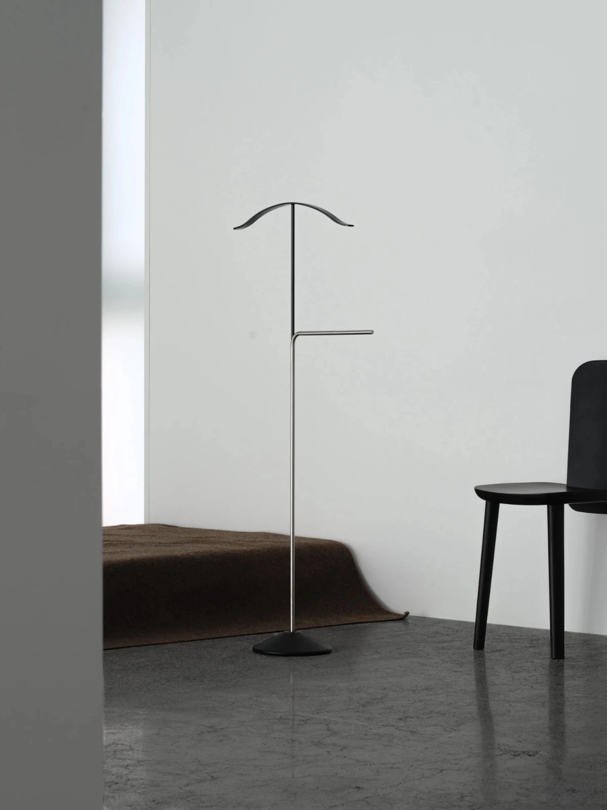 そのアイコニックなラインがコートハンガーとしての機能を伝えてくる。ハンガーが宙に浮いたようなデザインは、次に起こる動作を感覚的にイメージさせ、空間に物語性を与えるようだ。その下に伸びる水平のロッドはコートと干渉しないよう15℃方向が振られており、バッグを掛けたりなど、独特のコンポジションはそのまま機能のコラージュにもなっている。