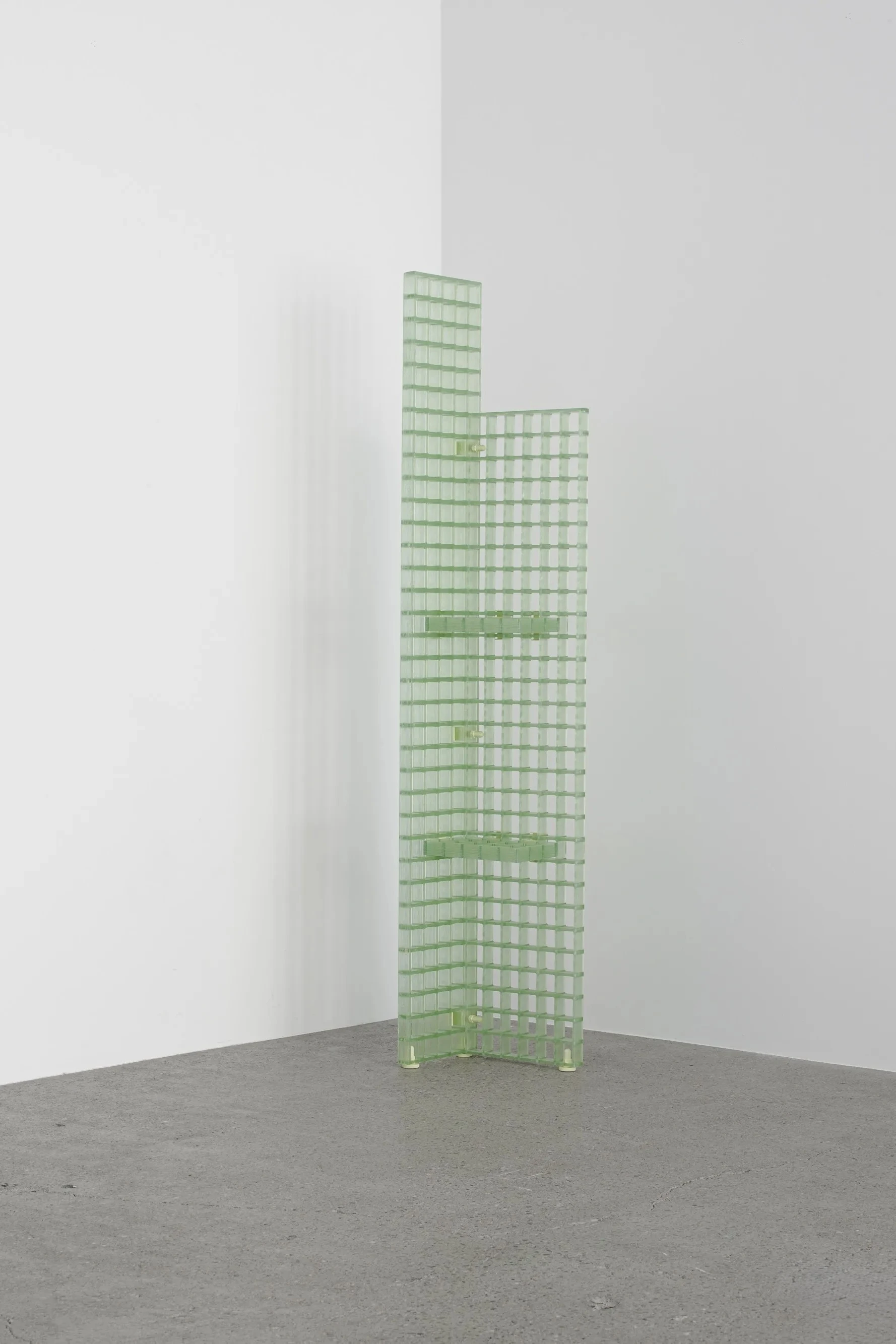 使用されているのはFRP製のグレーチングと、同色で塗装された既製金物。このプロジェクトは建築や都市のディテールに対するデザイナーの私的な解釈を家具スケールで再構築する試みであり、グレーチングの正方形グリッドを活かした多様な形態と機能を満たすシステムとなっている。