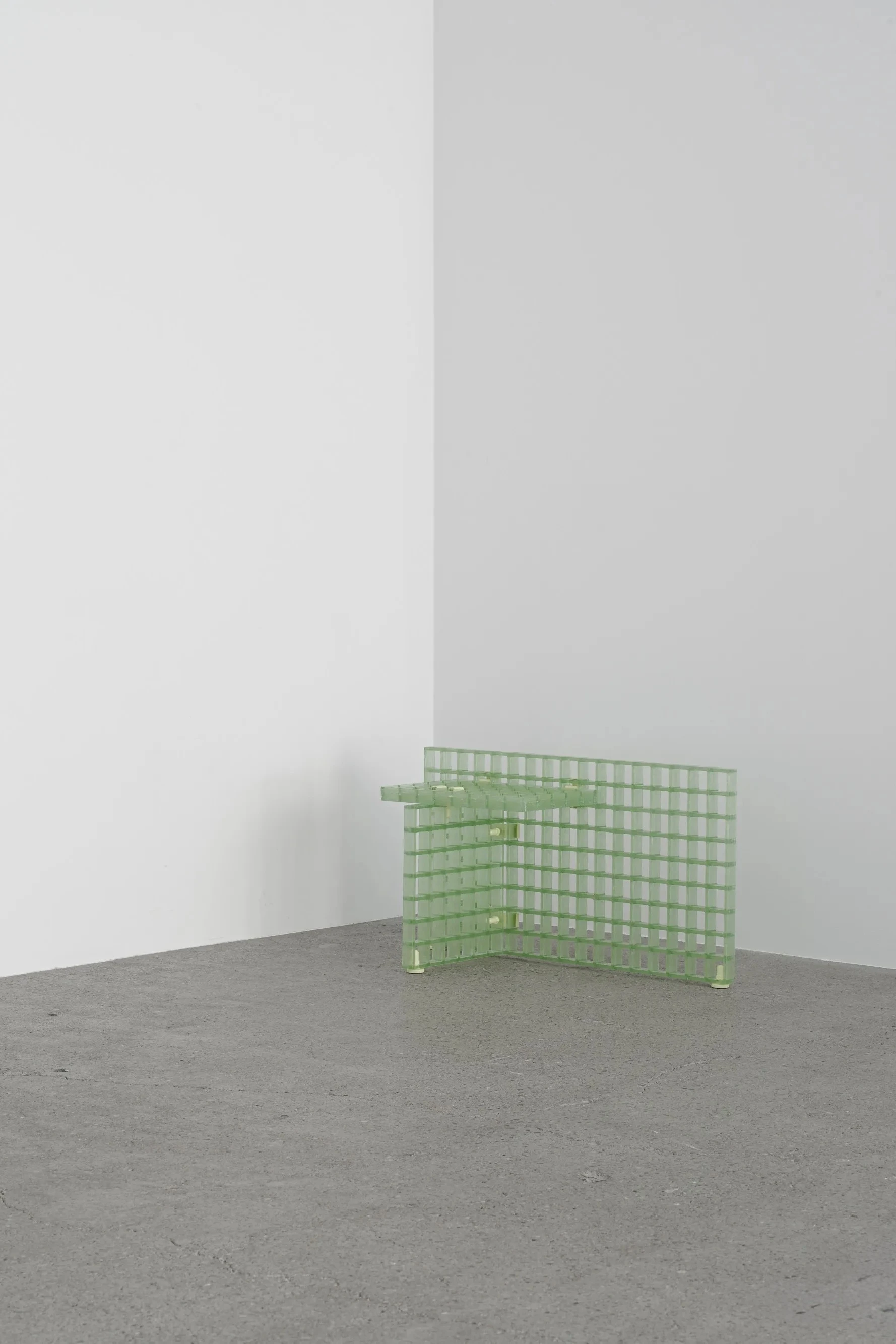 FRPグレーチングの元来の用途は商業ビルの外壁やベランダの柵などといった建材としての利用であり、最も分かりやすいところで言えば排水溝の蓋だろう。しかしそれが本来の用途を離れモノとしての存在感を放ち始めることで、独特の透明感、グリッドの持つ幾何学的な美しさといった、素材が本来持つ魅力に私たちの興味は惹きつけられる。接続に使用される既製の金具は、同色で焼付塗装されることにより等価に扱われ、金物としての役割を超えてデザインの魅力を引き立てている。