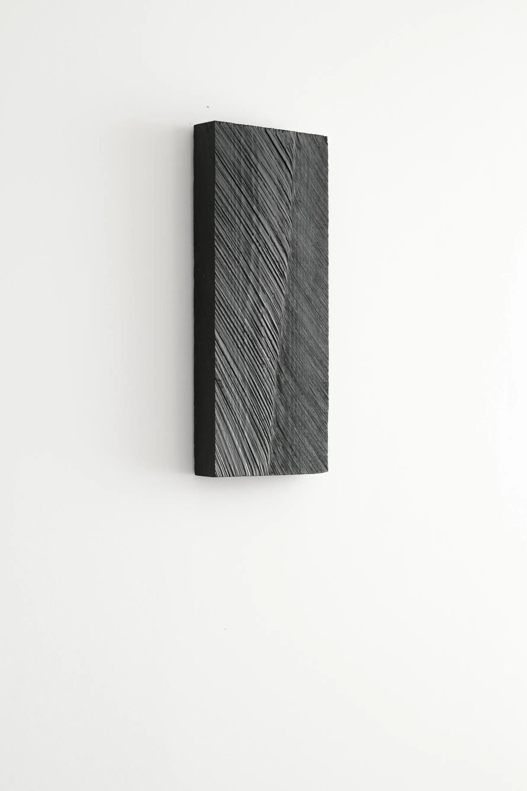 重厚でありながら静謐な家具やオブジェクトは、能登で産出されたヒバの無垢材のみで構成されている。表面のテクスチャは、チェンソーカービングによるもの。刃長や馬力の異なる三つのチェンソーを使い分けることで、見る位置や光の角度によって多様な表情が現れる。特筆すべきは、能登で木材加工を生業にする一人の生産者の手によって施されていることだ。個人の感覚や個性が反映されながらも、一つ一つが違った表情を持つ。