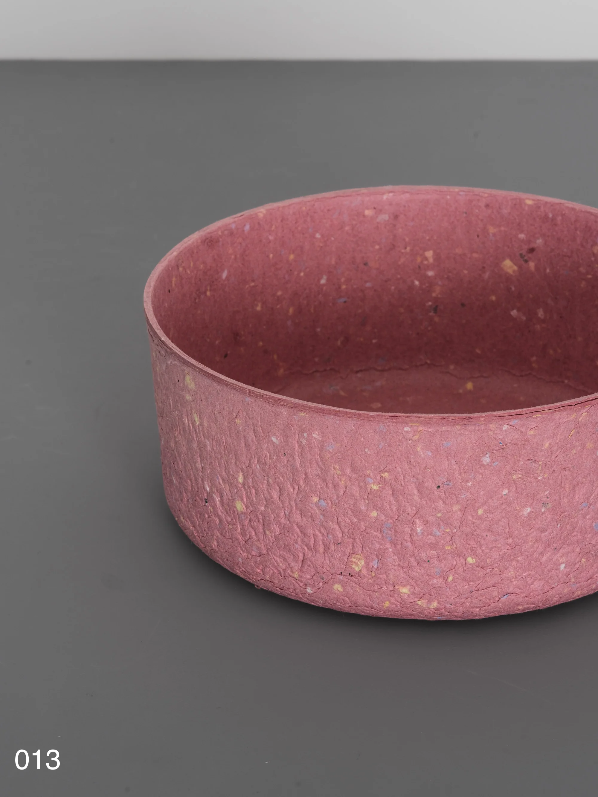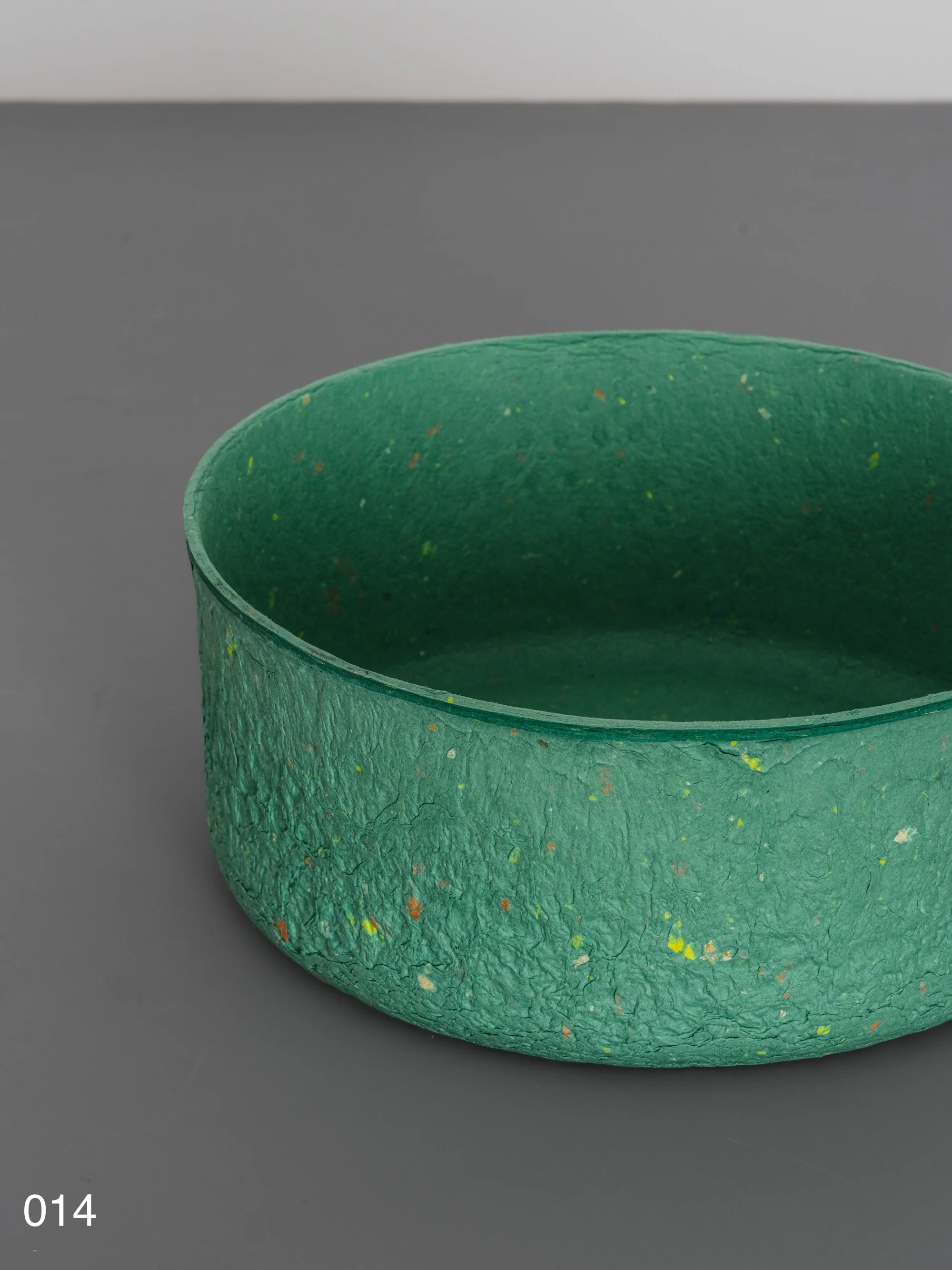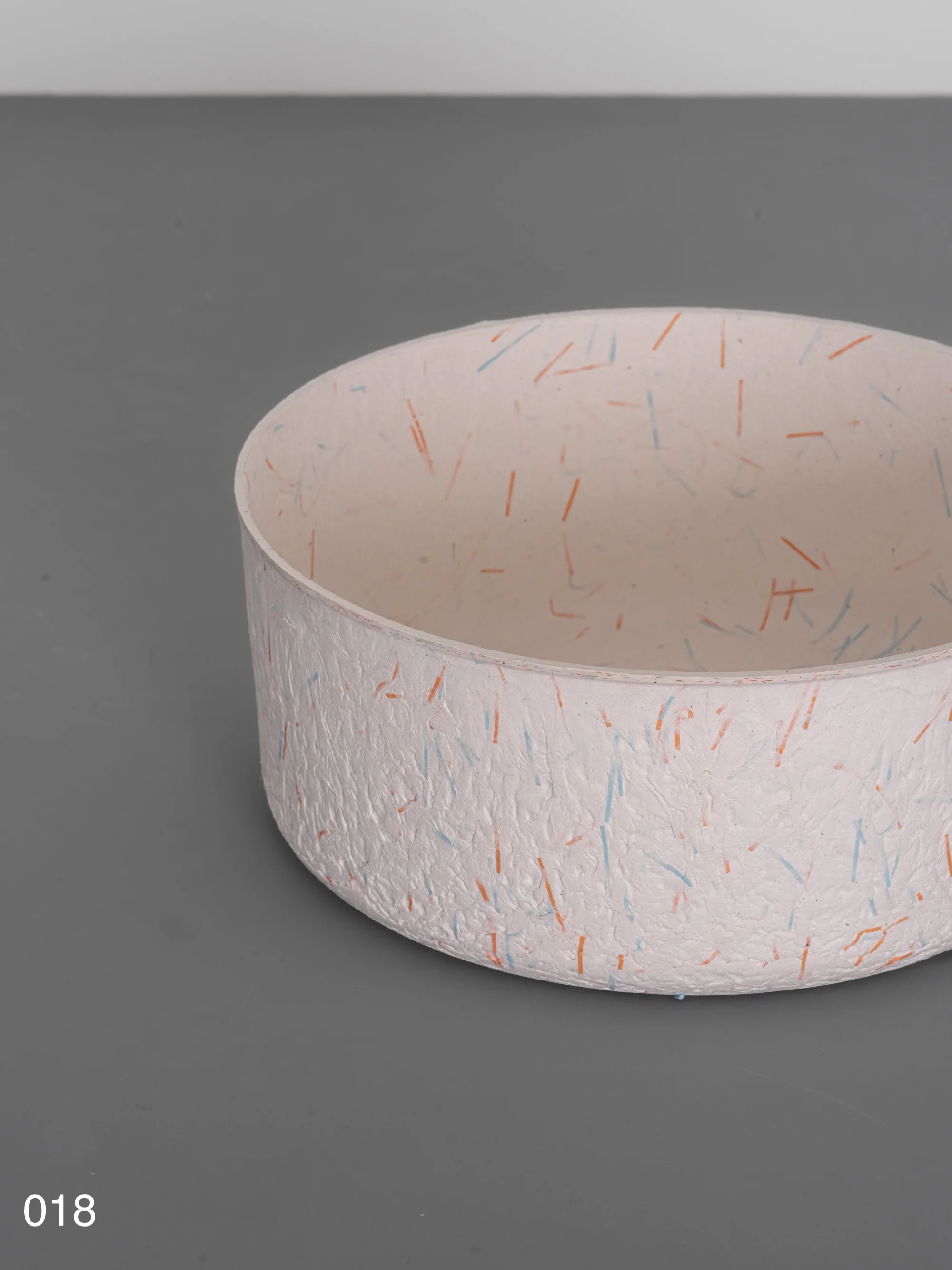 2018年に株式会社竹尾が主催する「TAKEO PAPER SHOW」をきっかけに始まった本プロジェクト。卵パックなどの緩衝材として広く用いられるペーパーモールドの技法に、色彩豊かな竹尾のファインペーパーを組み合わせることで、新たな表情を持つ作品が生まれました。以降も藤城は金型を借り受け、工場と協働しながら自身の手で制作を継続しています。